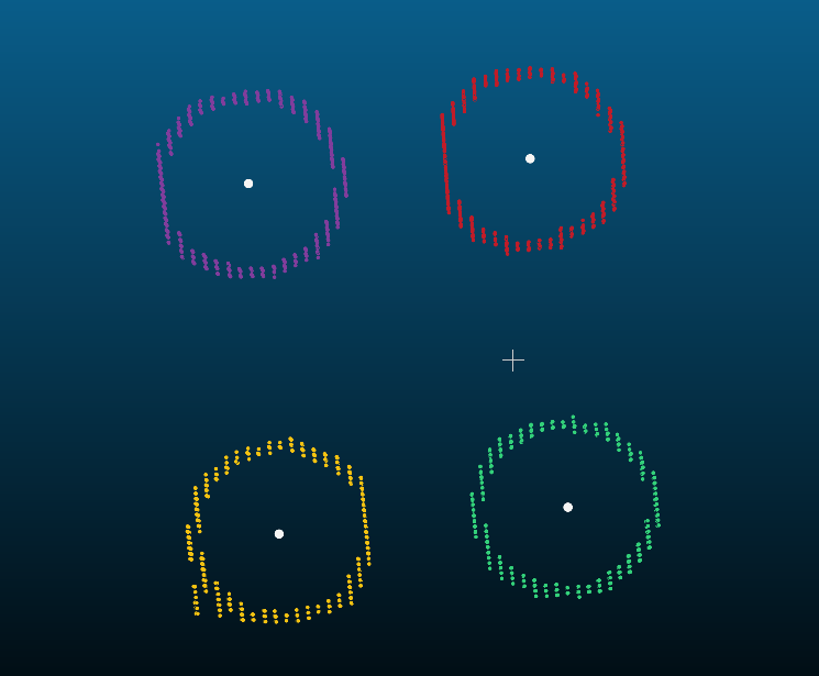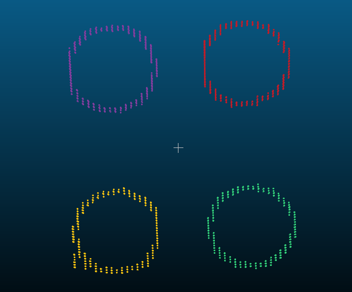 - 对边缘点云,进行欧式聚类(pcl的EuclideanClusterExtraction),根据聚类的最大点数限制去掉了四周边缘点,同时得到4个圆孔的边缘点云。