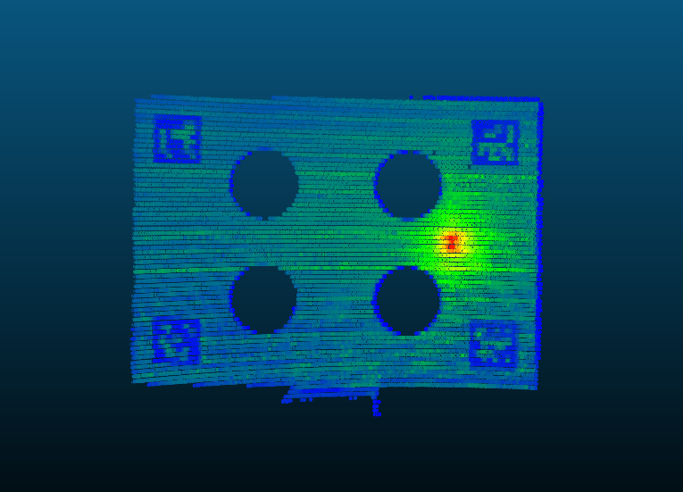 这个部分其实我觉得是整个算法流程最不优美的部分,也是需要人工介入的部分。这个步骤需要通过人工调整距离范围,来截取包含标定板的点云。可以允许截取到一些其他点云(因为后续还有平面拟合和边缘提取),但是必须截取到完整的标定板,否则后续的步骤会出错。我在一开始使用的时候,范围阈值设置不对,导致标靶截取的结果如下图所示,导致后续的平面拟合和边缘提取出错。